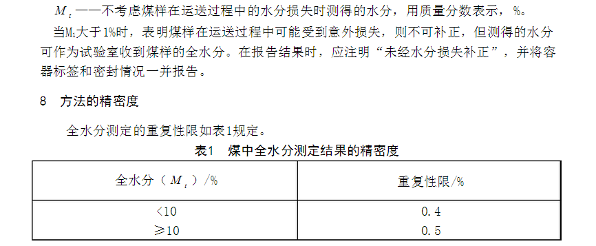 性差異,或雖有差異,但置信范圍很小。6.3 在測定全水分之前,應shou先檢查煤樣容器的密封情況。然后將其表面擦拭干凈,用工業天平稱準到總質量的0.1%,并與容器標簽所注明的總質量進行核對。如果稱出的總質量小于標簽上所注明的總質量(不超過1%),并且能確定煤樣在運送過程中沒有損失時,應將減少的質量作為煤樣在運送過程中的水分損失量,計算水分損失百分率,并按7.3所述進行水分損失補正。