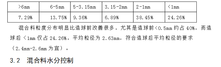 實(shí)踐證明,燒結(jié)**佳水分值比混合料**佳制粒水分值低0.5-1.0%,根據(jù)混合料水分大小調(diào)節(jié)加水,主要是為了造球。經(jīng)過混合料造球,減少了0-3mm級(jí)別含量,可以在很大程度上提高燒結(jié)料層透氣性,增加燒結(jié)產(chǎn)量和提高質(zhì)量。值得說明的是,球粒過大,垂直燒結(jié)速度會(huì)降低,產(chǎn)量降低。